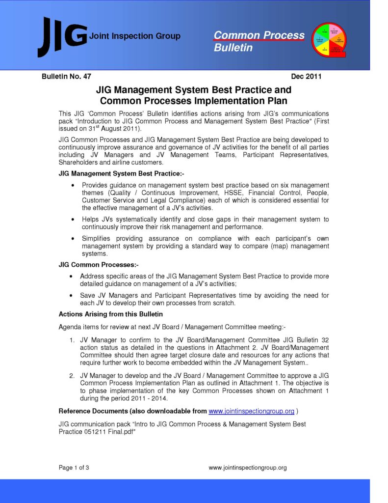 The purpose of this Bulletin is to identify actions arising from JIG’s communications pack “Introduction to JIG Common Process and Management System Best Practice” (First issued on 31st August 2011).